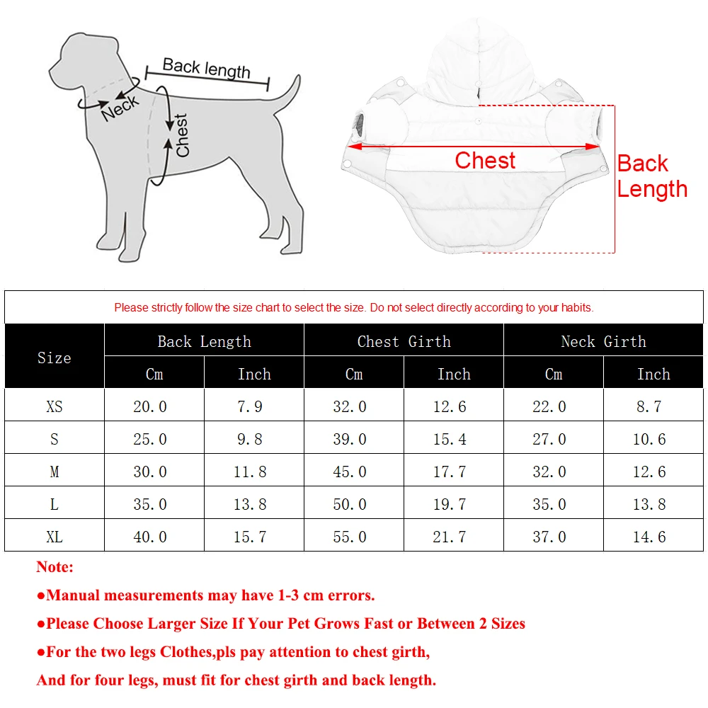 2.Please Choose Larger Size If Your Pet Grows Fast or Between 2 Sizes For the two legs Clothes,please pay attention to chest girth,And for four legs, must fit for chest girth and back length.